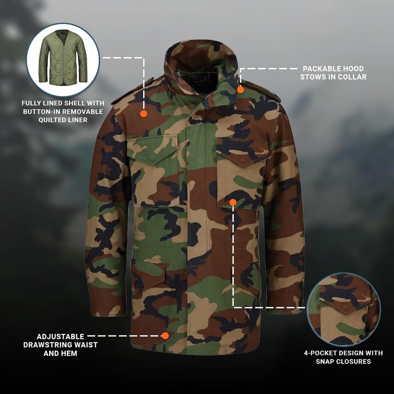 - AUTHENTIC DESIGN – This M65 coat is built from military specifications down to its authentic NYCO sateen fabric, unlike many imitators using lower quality polyester blend fabrics. It offers a layering design that allows for use in any element or for casual wear.