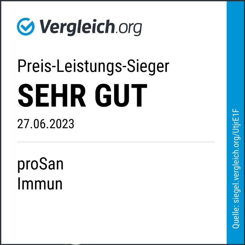 - Price-performance winner 2023: The independent comparison platform vergleich.org has awarded proSan immun in the category "Strengthen immune system" as a product with the best price-performance ratio. proSan immune is highly dosed with many immune-specific vitamins and minerals as well as OPC from grape seeds, bioflavonoids and carotenoids. Therefore, we offer an extra high dosage in perfect dosage form at a fair price.