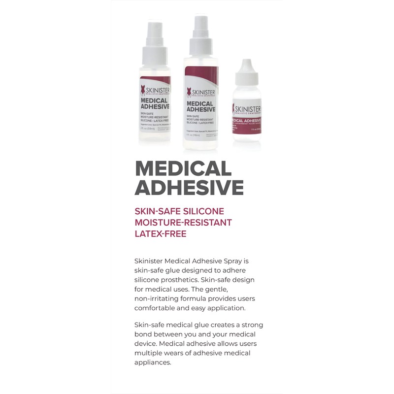 Skinister Medical Adhesive Spray is skin safe glue designed to adhere silicone prosthetics. Designed for medical uses, visual effects, and cosplay costumes. Attach silicone hip pads, mastectomy’s breast forms, and ostomy appliances safely to your skin. Safely attach eyebrows, body jewelry, and other costume prosthetics. Use Skinister Medical Adhesive Remover to safely clean prosthetics and remove adhesive in-between applications.