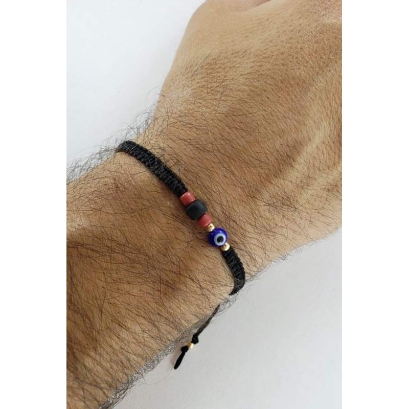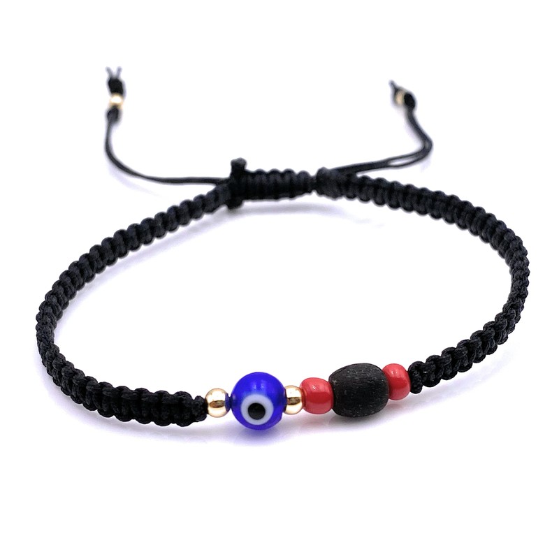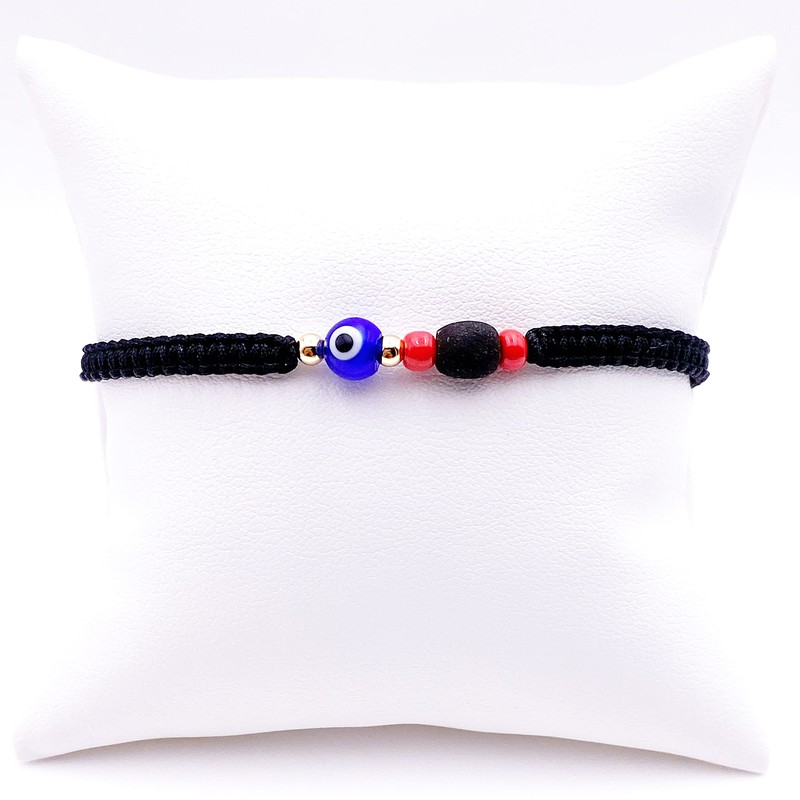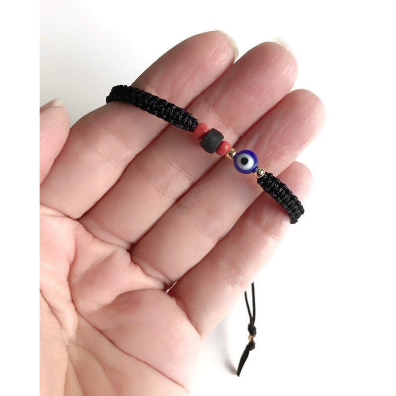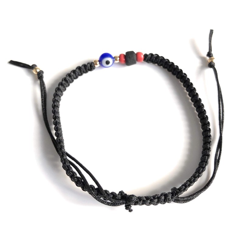 | Material Type: | linen cord, gold plated balls, glass evil eye bead, jet stone bead |