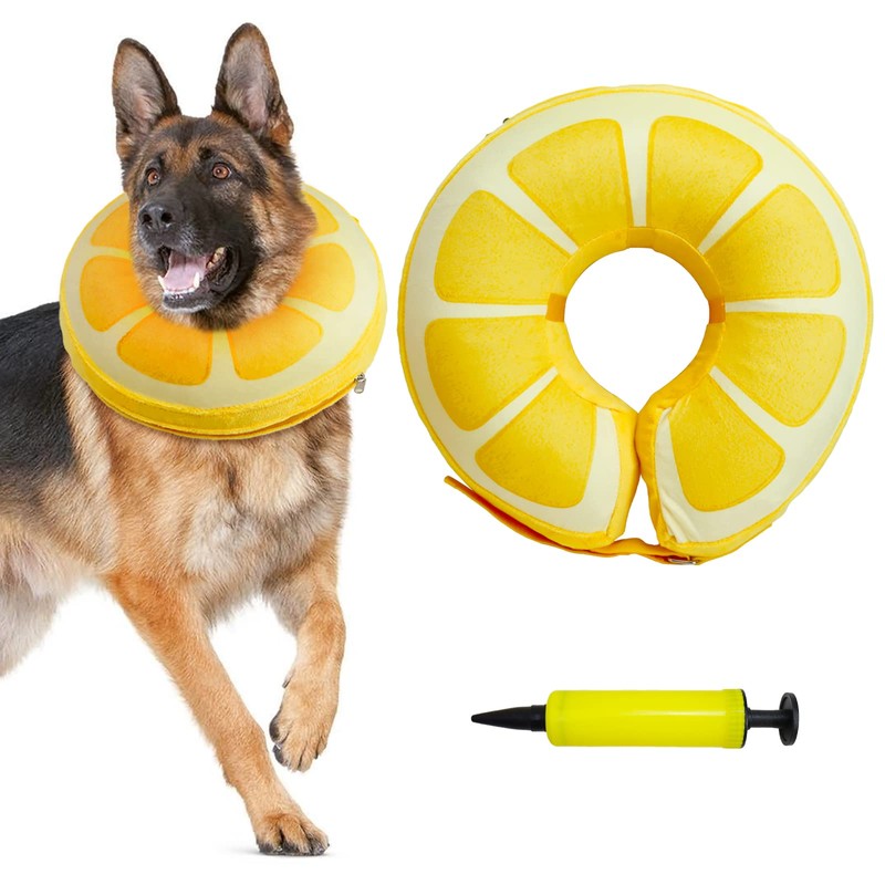 - 【Unique Double-Sided Design】 You will receive a lemon inflatable dog cone and 1 yellow inflatable pump. Unique and funny double-sided lemon pattern design, lightweight and cute, and easy to carry, it is not only a donut collar design for dogs, but also a cute decoration for dogs, the inner airbag keeps it light and does not block your dog's sight. Upgraded high-quality non-stick fabric, you don't need to clean the pet hair on the inflatable dog cone frequently.