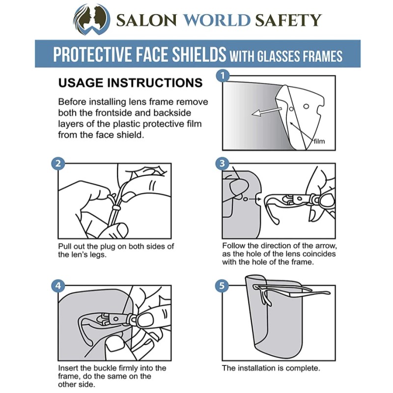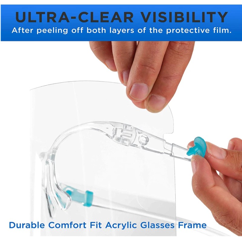 Ultra-Clear and Anti-Fogging: Face shields provide super clear visibility and have superior optics that let in the maximum amount of light, while the anti-fogging material resists fog under extended use. The shield is crystal clear, after peeling off both layers of the protective film. Reusable after disinfecting. Some assembly required.