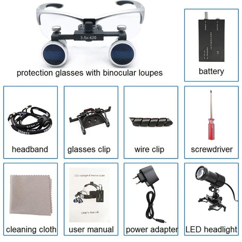 Protector 2,5X/3,5X 420 mm Lupa Binocular Lupa Cirugía Quirúrgica Lupa con luz de Cabeza de Foco (3.5X, Azul)