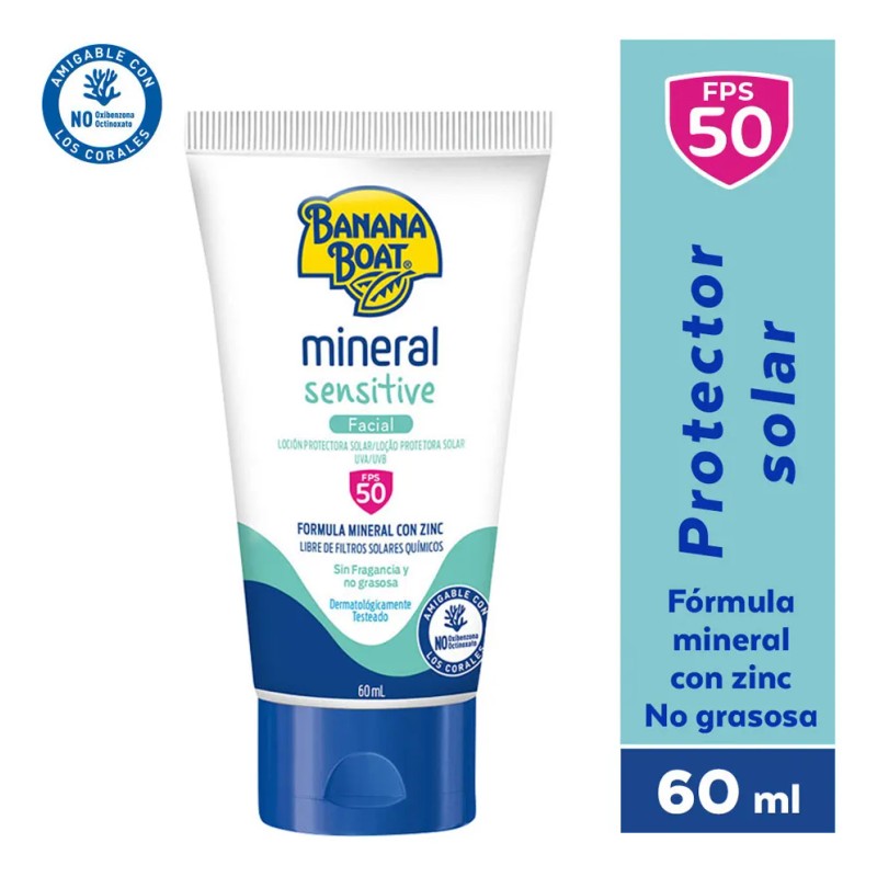 "Banana Boat Mineral Sensitive para el rostro, es un protector solar en loción diseñado para aquellas pieles que requieren un cuidado extra. Su fórmula es a base de zinc y óxido de titanio, libre de filtros solares químicos. Testeado por dermatólogos para las pieles sensibles.