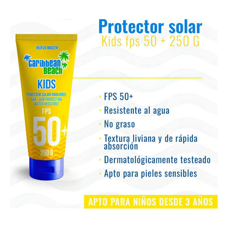 El Protector Solar Caribbean Beach Kids FPS 50+ está especialmente formulado para cuidar la piel delicada de los niños, brindando alta protección de amplio espectro contra rayos UVA y UVB.