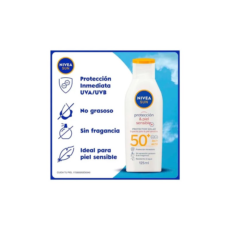 El protector solar de NIVEA SUN para piel sensible con FPS 50+ y su fórmula enriquecida con Vitamina E, ayuda a minimizar el riesgo de alergias causadas por el sol en pieles sensibles, dejando la piel suave y tersa. Efectivo sistema de filtros UVA/UVB que brindan protección inmediata y ayuda a prevenir quemaduras solares y el envejecimiento prematuro de la piel. Resistente al agua. Textura ligera.