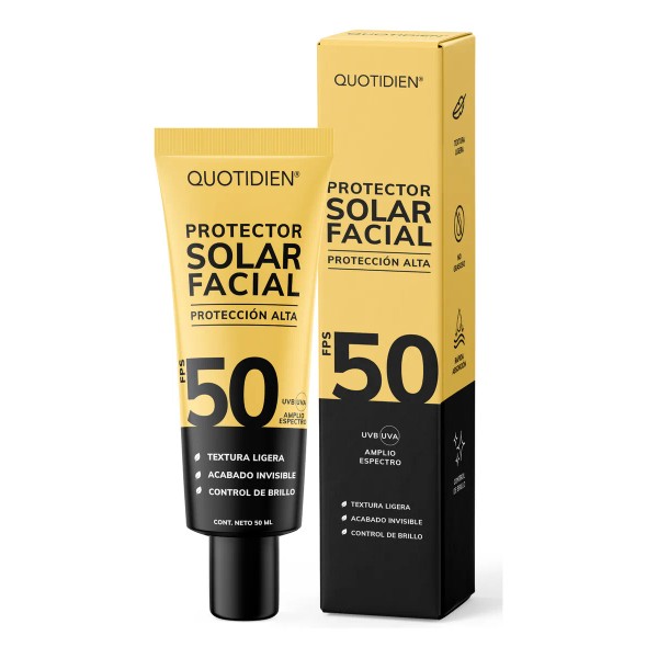 ¡Protege y cuida tu piel cada día con nuestro Protector Solar Facial Quotidien FPS 50! Diseñado para ofrecer una alta protección contra los rayos UVB y UVA, este protector solar de textura ligera se absorbe rápidamente, dejando un acabado invisible y sin brillo que es perfecto para cualquier tipo de piel, incluso las más sensibles. Su fórmula dermatológicamente probada es ideal para uso diario, brindando la defensa que necesitas para disfrutar del aire libre con total tranquilidad.