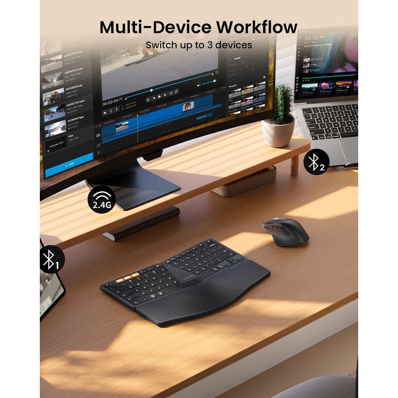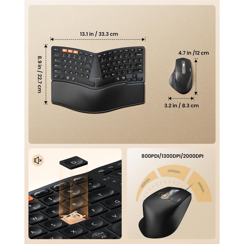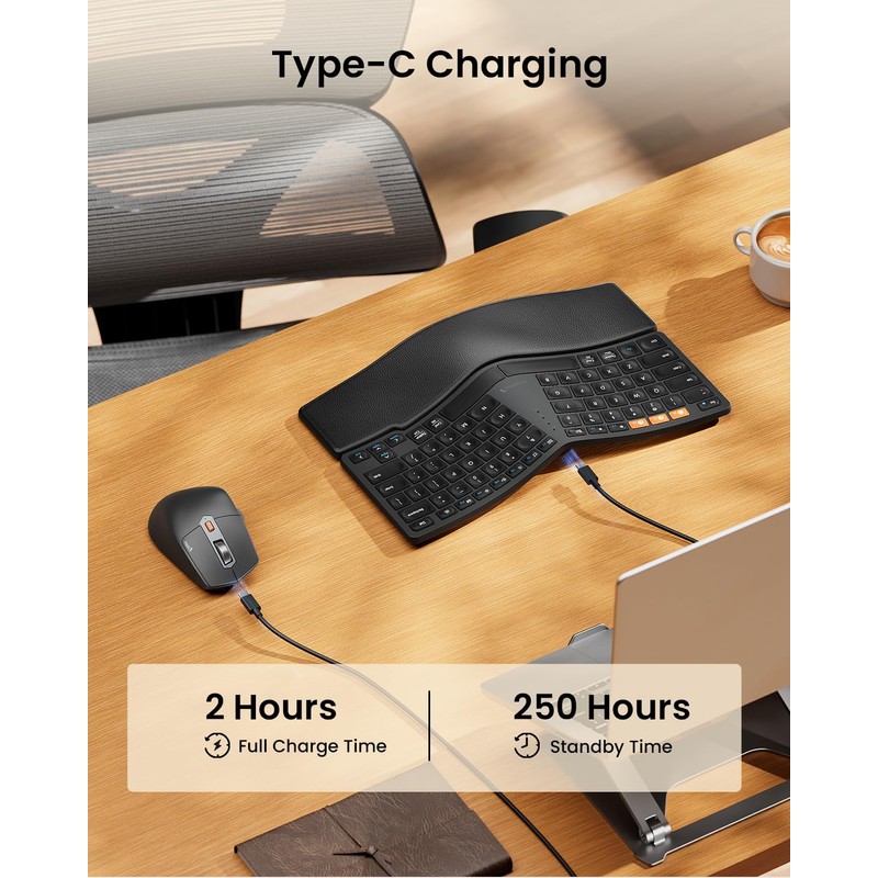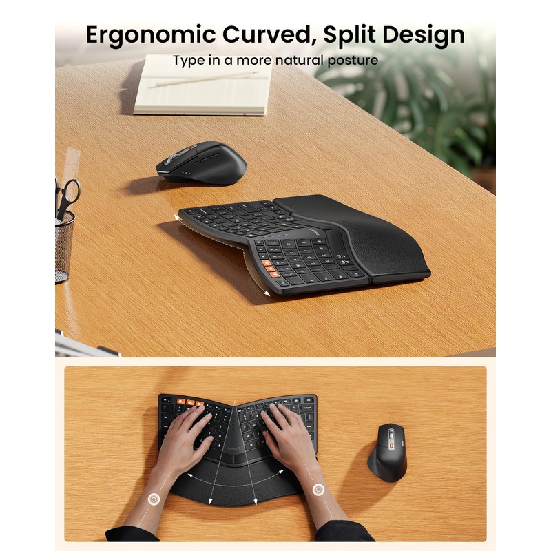 • Compact Ergonomic Keyboard: Compact split layout(80 keys) for reducing repetitive shoulder motion, paired with ergonomic mouse, helps correctly position your hands when typing, saving from straining your wrists.