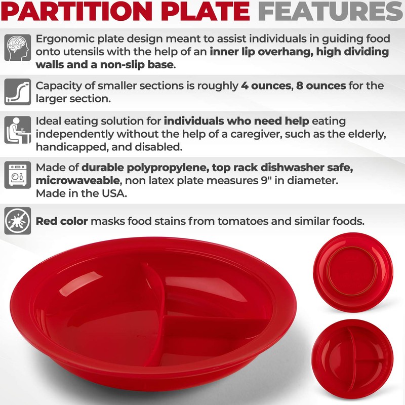 - Ergonomic plate design meant to assist individuals in guiding food onto utensils with the help of an inner lip overhang, high dividing walls and a non-slip base.