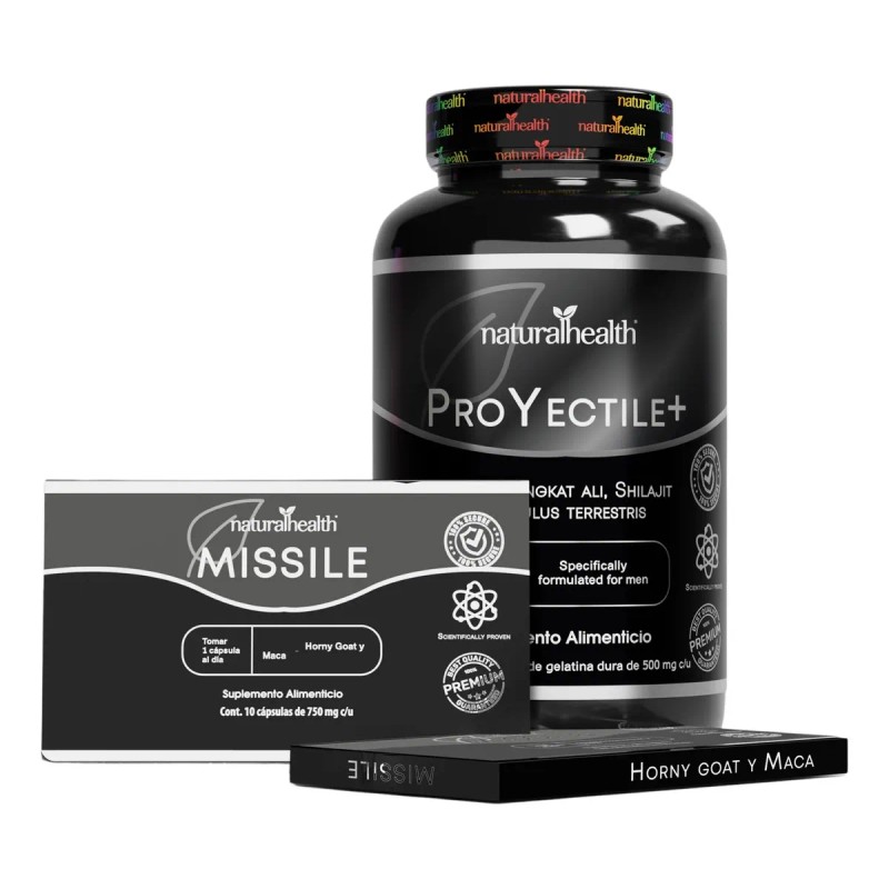 Descubre el poder de ProYectile+ con este exclusivo kit que incluye 120 cápsulas y 2 carteras de 10 cápsulas de Missile Natural Health. Este suplemento energizante está diseñado para adultos mayores de 18 años, combinando ingredientes naturales como Maca y Horny Goat, conocidos por sus propiedades revitalizantes. Cada porción de 2 g es libre de gluten y lactosa, lo que lo convierte en una opción adecuada para quienes buscan un estilo de vida saludable. Su formato en cápsulas facilita la ingesta diaria, recomendándose 2 cápsulas de ProYectile+ y 1 de Missile al día. Este producto no es un medicamento, y su uso es responsabilidad del consumidor. Con un peso neto de 300 g, este kit es ideal para quienes desean potenciar su energía y bienestar de manera natural. ¡Atrévete a experimentar sus beneficios. Aviso legal • Edad mínima recomendada: 18 años.