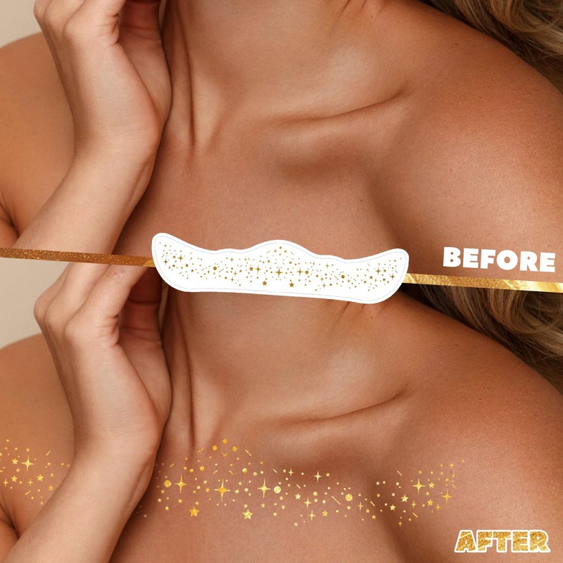 - GLITTER TEMPORARY COLLARBONE TATTOO: You will receive 6 gold metallic collarbone tattoos with star-shining patterns. The magnificent patterns shining with golden light, combined with the simple operation,easily adding a unique charm