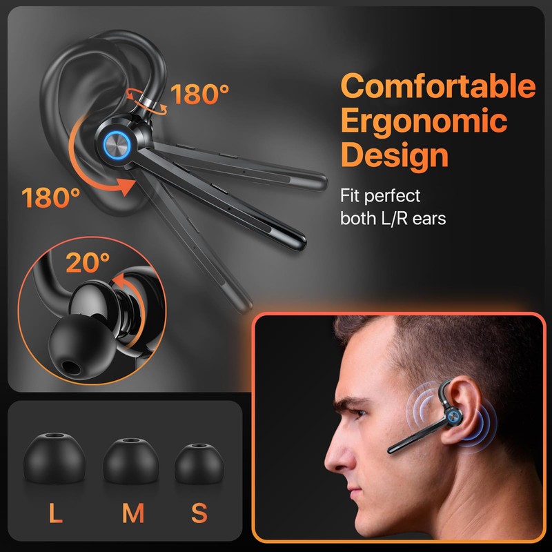 • Comfortable Ergonomic Wear Design:Engineered for all-day comfort, this headset bluetooth features a lightweight, ergonomic build. The in-ear part rotates 20°, the ear hook 180°, and the mic handle 180°, ensuring a snug fit. Made from skin-friendly materials, it’s ideal for extended use and functions as a versatile bluetooth headset.