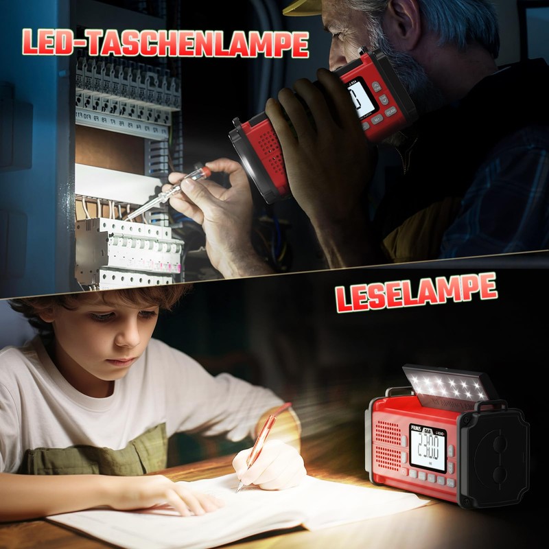 • 【Notfall-Lebensretter】Das akku Radio ist mit einem eingebauten 10000mAh-Akku ausgestattet, der ein schnelles Aufladen Ihres Telefon im Freien ermöglicht. In Notfällen aktiviert das Drücken der "SOS"-Taste einen blinkenden SOS-Alarm, um Aufmerksamkeit zu erregen. Zusätzlich sorgt der Handgelenkkompass dafür, dass Sie sich nie im Wald verirren und macht es zu einem zuverlässigen Begleiter für Outdoor-Abenteuer.