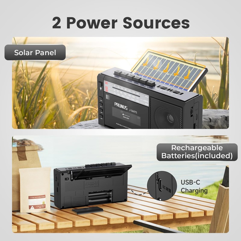 - 3 Power Sources Cassette RadioOur cassette boombox features 3 charging options: USB-C, built-in solar panel for off-grid charging, and rechargeable batteries. The solar panel is perfect for outdoor adventures, ensuring you have power wherever you go. Whether you're at home, outdoors, or during a power outage, you'll always have a reliable power source. No need to worry about running out of power! Note: Please use a 5V/1A or 5V/2A adapter for charging.