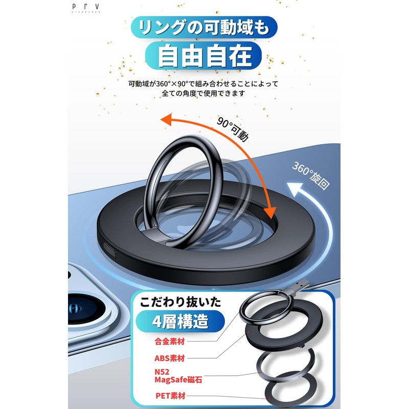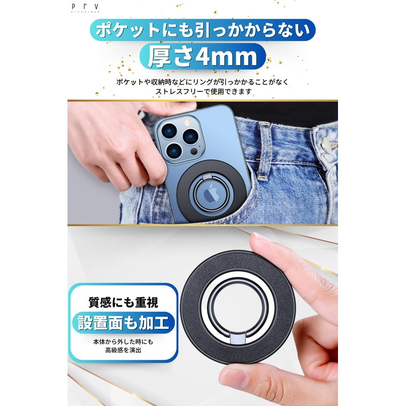 Prv Magnetic MagSafe Smartphone Ring, Magnetic Smartphone Ring, Magnet, Thin (0.2 inch (4 mm), Lightweight, 0.7 oz (20 g), Strong Magnetic Force, 4.4 lbs (2 kg), Angle Adjustable, 360°, Bunker Ring,