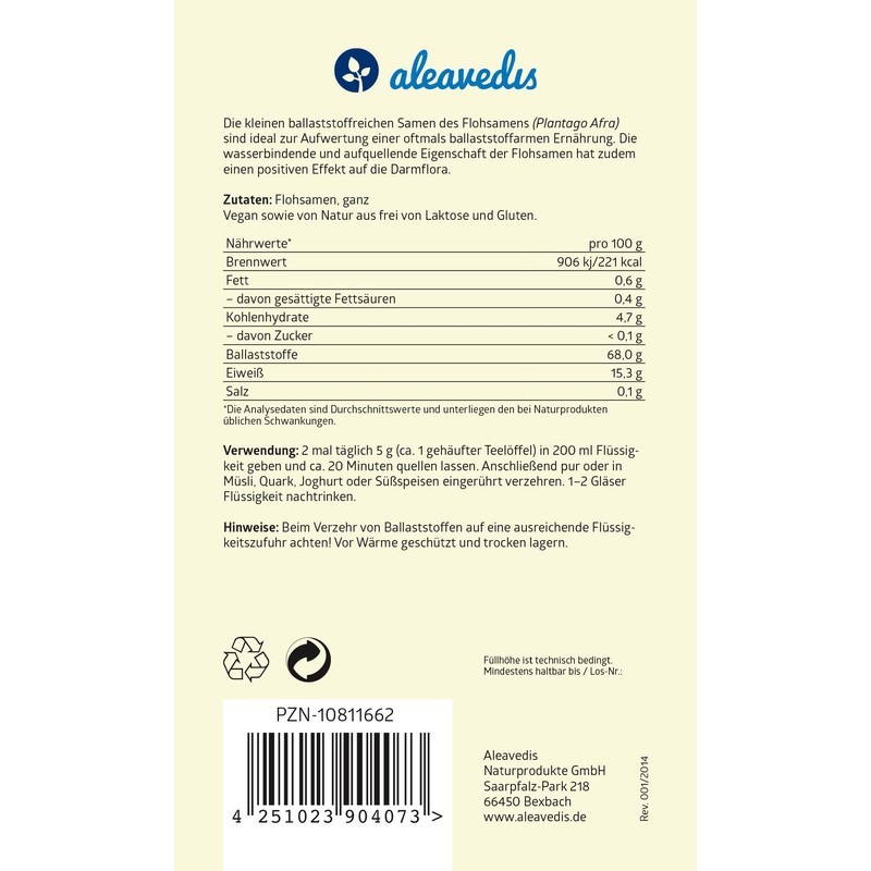 2 times a day 5 g (approx. 1 heaped teaspoon) in 200 ml of liquid and approx. Leave to swell for 20 minutes. Then consume pure or stirred into cereal, quark, yoghurt or desserts. Drink 1-2 glasses of liquid.