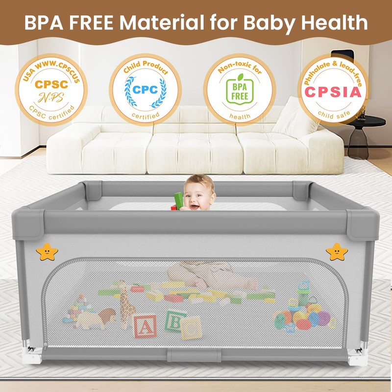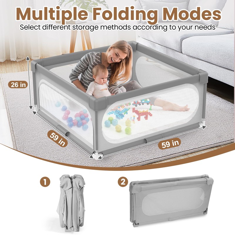 Ptcide Foldable Baby Playpen 59""×59"", Playard for Babies and Toddlers, Portable Safety Fence Lightweight,No Installation, Indoor & Outdoor Baby Playpen with Ocean Balls*50, Grey