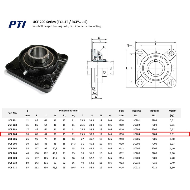 PTI Flange Bearing Shaft Diameter 17 mm Type UCF 203 Certified Industrial Quality