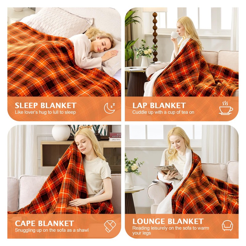 PTQ Electric Heated Blanket 84"x90",Fast Heating Queen with 8 Hours Auto Off/8 Heats Levels,Soft Orange Plaid Sherpa Electric Blanket with ETL Certification & Over-Heat Protection