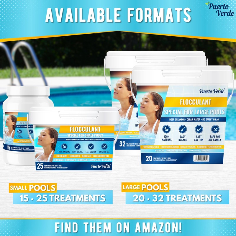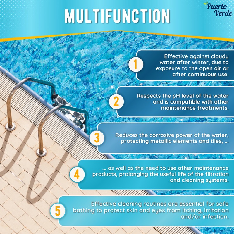 - Crystal clear water. The Puerto Verde flocculant guarantees a deep cleaning of water that has become cloudy after winter, after staying outdoors or after constant use. Once the treatment has started, our swimming pool clarifier collects all impurities floating in the water, brings them directly to the bottom and makes it easier to vacuum afterwards. Compatible with all types of filters and cleaning systems.
