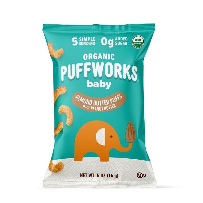 - Contains 12- 0.5 Ounce Bags of Puffworks baby Organic Nut Butter Puffs (6 peanut butter, 6 almond butter), an easy way to introduce peanut and almond to baby early and keep snacking healthy