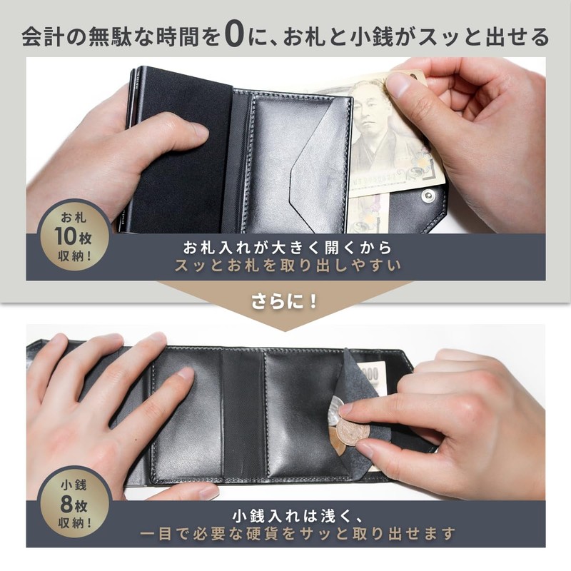 A new classic for the cashless ere! Change your daily life. Now cashless payments are part of our daily life. But you want to carry cash and cards in case of emergency. This wallet is perfect for you and is designed to keep everything you need quickly. Smart storage for 7 cards, 10 bills and 8 coins. Just press the button and the card can be removed in 1 second. The bill compartment opens wide for easy access, and the coin purse is shallow so you can find the coins you need at a glance. Compact yet everything you need It does not lose the smartness of your cashless payments, and you can rest assured when you need it. Make your day more comfortable and smarter