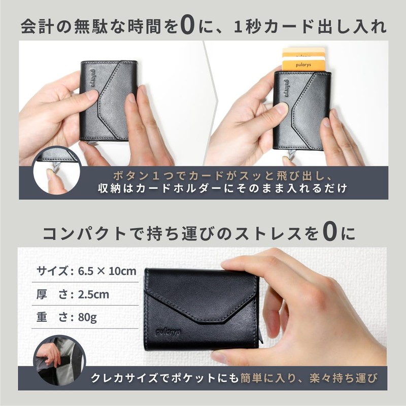 • Product Specifications: Manufacturer: Pularys Size: Approx. 2.6 x 3.9 x 1.0 inches (6.5 x 10 x 2.5 cm); Weight: Approx. 2.8 oz (80 g); Material: Italian leather (aniline finish); Country of Origin: Poland; Color: Black/Brown/Navy; Storage: 7 cards, 10 bills, 8 coins