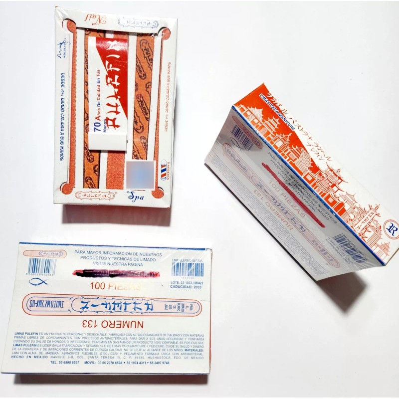 Caja con 100 limas Pulefin centro de madera dos pasos grado fino y mediano. Excelente herramienta para manicure y pedicure. Somos los fabricantes no se deje sorprender por imitaciónes o pirateria. Desde 1941 dando calidad a sus manos.en todos nuestros pedidos siempre enviamos limas de regalo! contamos con stock y se envía antes de lo indicado.