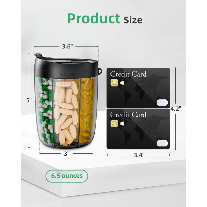 - Large Compartments: The PULIV pill holder weighs 6.5 ounces and features 1 XL compartment and 5 large compartments. The XL compartment can hold up to 57 fish oils, with each fish oil measuring 0.9" in length, while each of the large compartments can store 24 fish oils. This pill dispenser offers a convenient way to store 6 types of pills in one place. It has a height of 5.0" with a lid diameter of 3.6" and a base diameter of 3.0". And 20 stick-on labels can help differentiate each compartment