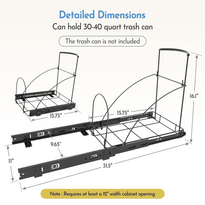 - [ REASONABLE SIZE DESIGN ] Slide-Out Trash Can Rack Dimensions: 11"W x 15.75"D x 16.1"H; Minimum Cabinet Dimensions Required–12"Wx 16.75"Dx 17.1"H. The pull-out cabinet system can hold up to 35 quarts of litter. Any problem contact us anytime.