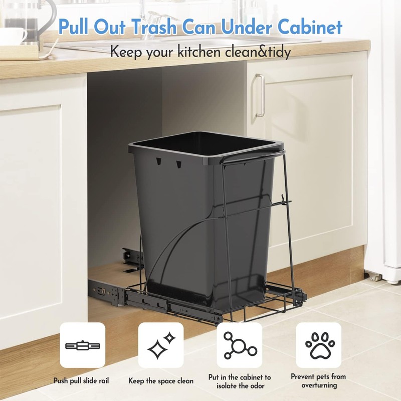 - [ HIDDEN DESIGN] Do you want to fall in love with cooking in a clean kitchen? Do you want to be no longer bothered by cleaning up the garbage anywhere in your kitchen. Our pull out trash could completely solve your problems. Welcome to explore the usage!