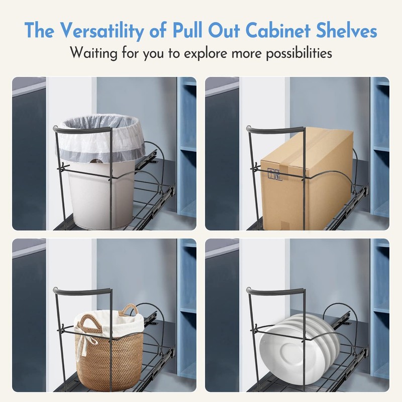 - [ INTIMATE HIDDEN DESIGN ] You could never worry you kitchen looks duty because your trash can or recyclables are stored under the cabinet. Sliding shelves and the ball bearings all made of high-quality heavy-duty steel which could withstand the wear and tear of daily use perfectly.