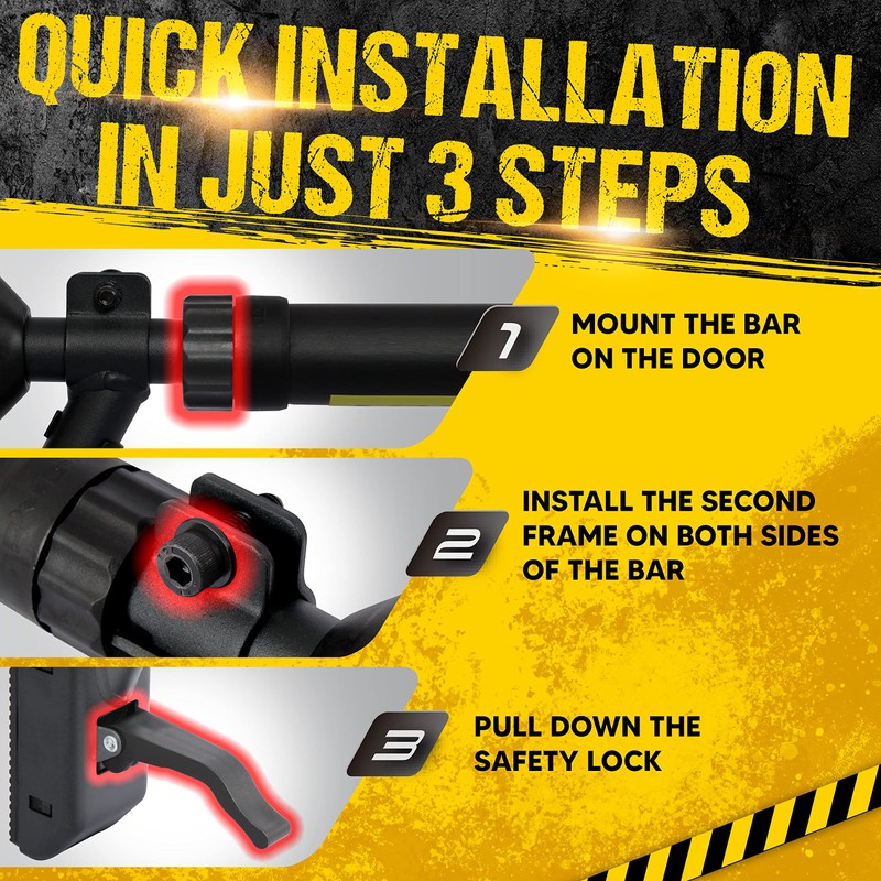 - Quick installation – in just 3 easy steps, you can mount the bar on your door, install the second frame on both sides of the bar, and pull down the safety lock. No fuss, no hassle, and you're ready to work out in no time!