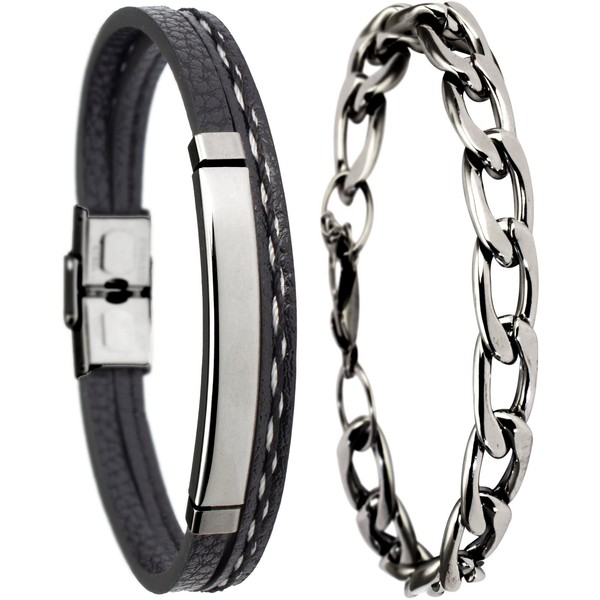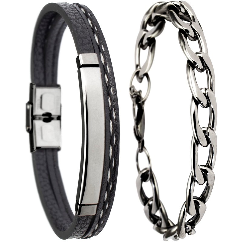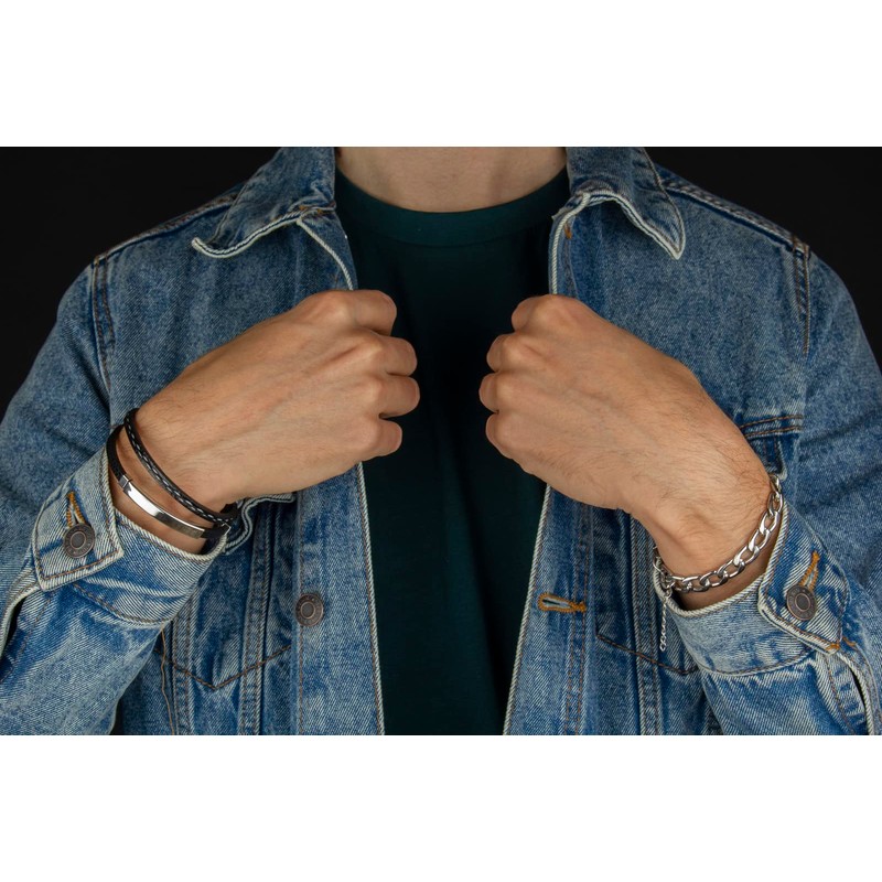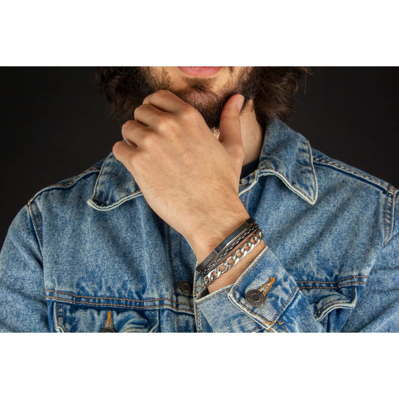 Pulseras para Hombre │ Cuero Negro y Cadena Plateada │ MB12