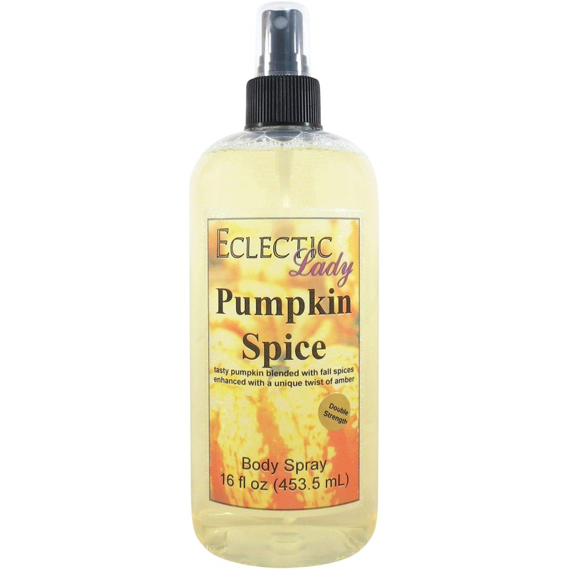 Our Pumpkin Spice is tasty pumpkin blended with fall spices, enhanced with a unique twist of amber. This fragrance is phthalate free. Our body spray adds a little bit of moisture to your skin along with a light fragrance. Our Double Strength formula contains double the fragrance of our original body sprays for people who like a stronger body spray. All of our products are made to order. To avoid leakage in transit, Eclectic Lady tapes all caps on our sprays and places each bottle into it's very own reclosable bag.