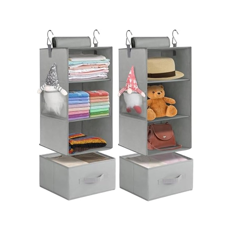 punemi 3-Shelf Hanging Closet Organizer, 2 Pack Closet Hanging Organizer with Drawers, Foldable Hanging Closet Shelves for Rv, Camper, Locker, 22.8" D x 11" W x 11" H, Grey