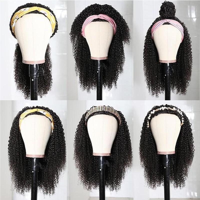 - Material of headband wig human hair: Headband Wig for Black Women is Unprocessed 10A Brazilian hair. It feels soft and smooth, without tangles, and has minimal shedding. You can dye, curl and straighten as needed,Our Kinkly Curly Headband Wig Has Elastic Ice Silk Headband Attached, with 4 combs and adjustable straps to fit all heads Headband wig color: Natural Color Density: 180% density. Length: 12-20 inch Human Hair. Cap Size: Average 22-22.5Inch (Adjustable)