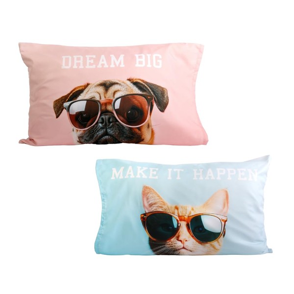 - Whimsical Cat & Dog Design. Add a playful touch to your bedding with this 2-pack of reversible pillowcases featuring funny cat and dog illustrations. Perfect for pet lovers and animal enthusiasts, these cases bring a quirky and charming vibe to any room.
