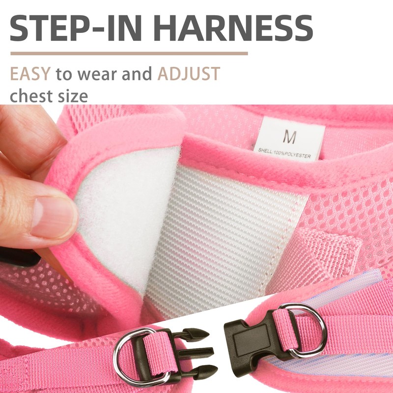 • STEP IN, NO PULL, NO CHOKE: - The harness is adopted magic strap closure, so it's very easy for wearing. Just open the harness, let your dog's front legs through the harness, then reclose the closure and buckle it up, and connect the leash with double D-rings, finished! Cushioned design reduces neck friction, and the metal D-ring easily links to leash hooks, not easy to swing, preventing suffocation and pull