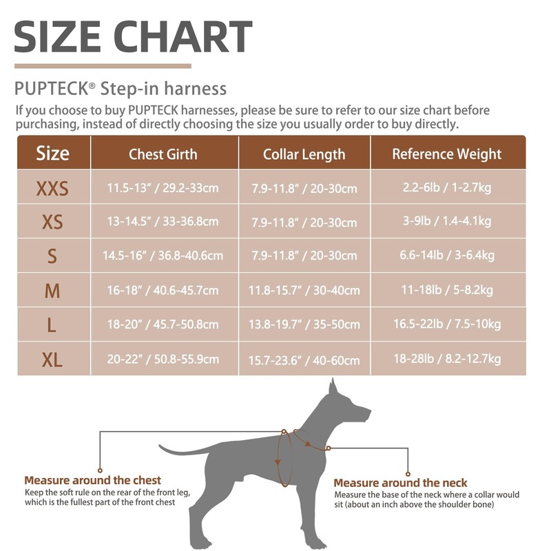 • SIZE GUIDE: - [XXS: Harness Chest 11.5"-13", Collar Length 7.9"-11.8"]; [XS: Harness Chest 13"-14.5", Collar Length 7.9"-11.8"]; [S: Harness Chest 14.5"-16", Collar Length 7.9"-11.8"]; [M: Harness Chest 16"-18", Collar Length 11.8"-15.7"]; [L: Harness Chest 18"-20", Collar Length 13.8"-19.7"]; [XL: Harness Chest 20"-22", Collar Length 15.7"-23.6"]. Please always measure your dog and refer to our brand size chart