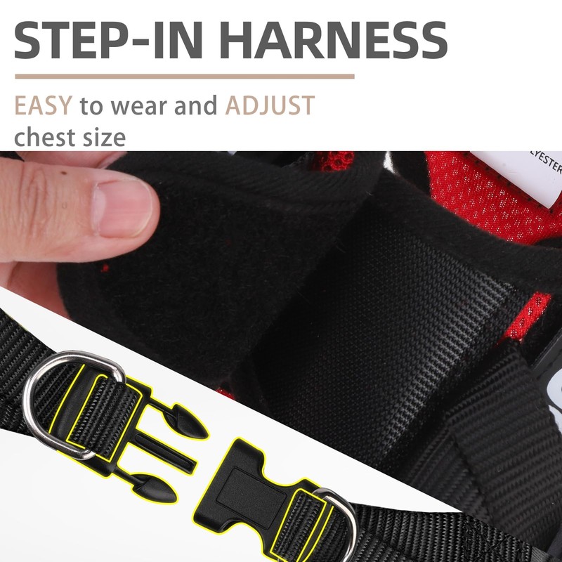 - EASY TO PUT ON & TAKE OFF - The harness is adopted with a step-in design, with no complicated wearing process, just let your dog's front legs through the harness, then close the magic strap and buckle, and finished! This harness is very friendly for those naughty dogs, it's also easy for owners to use