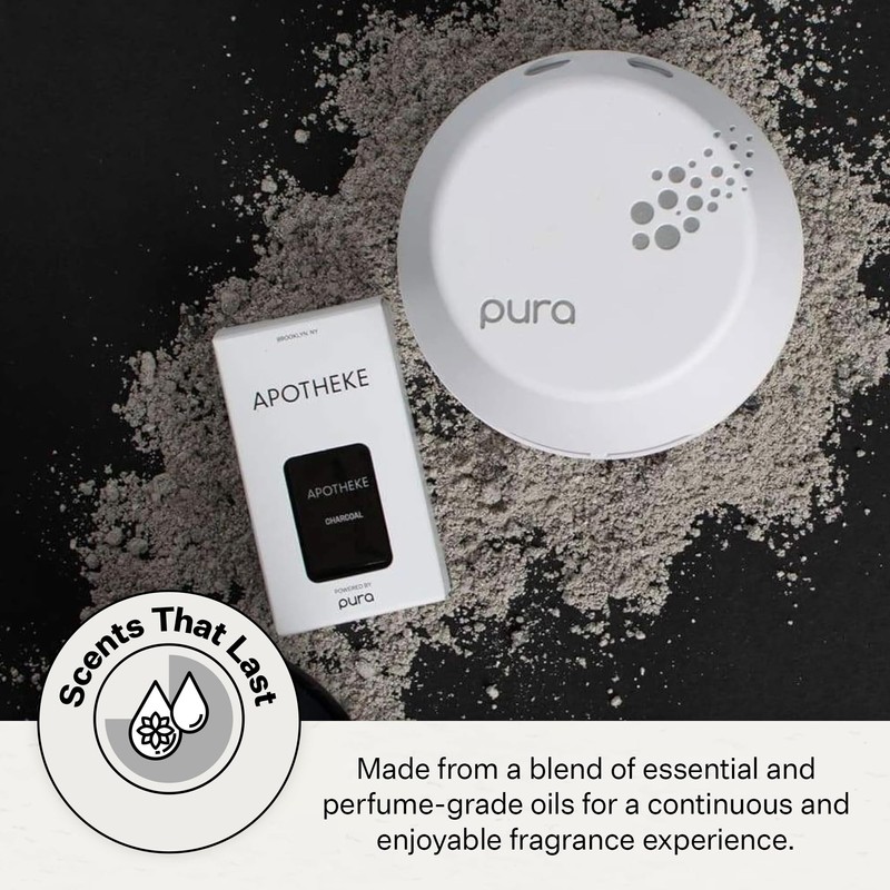- Smart Diffuser Fragrance Refill: Refresh your home and refill your Pura Smart Diffuser with APOTHEKE’s Charcoal Fragrance 2-Pack refills. Create a personalized scent experience in your home. One vial lasts up to two weeks, running 8 hours a day at a level 5 intensity. Two 10 mL vials.