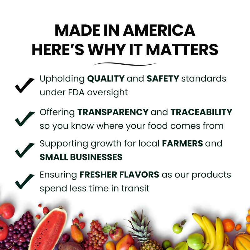 • MADE IN THE USA: Our products uphold stringent quality standards overseen by the FDA, ensuring transparency and support for local economies while delivering fresher flavors with shorter transit times.