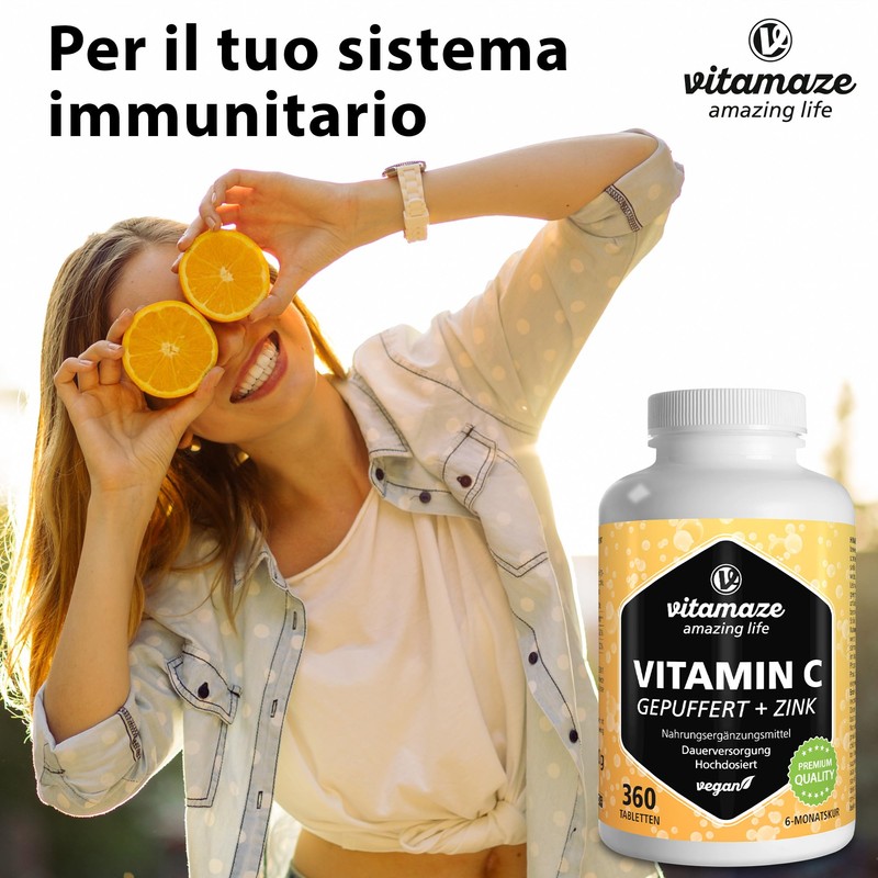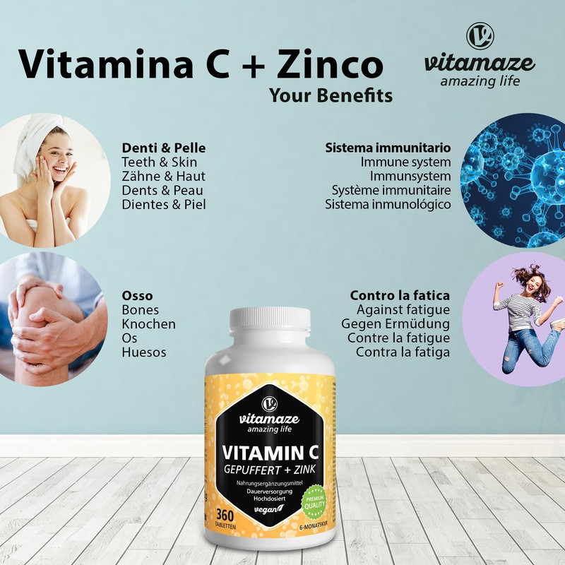 - HIGH DOSAGE: 360 vegan tablets with a daily dose of 1000 mg of vitamin C and 10 mg of zinc. In buffered form, our vitamin C tablets are particularly gentle on the stomach.
