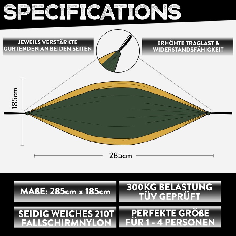 - No. 1 Strongest & Heavy Duty Hammock: Extra reinforced and unique strap design on the hammock ends made of 100% no-stretch polyester + 3-fold reinforced seams (triple power stitching) + 100% durable and weatherproof parachute nylon ensure a load capacity of 300 kg. Camouflage colour for survival accessories in green/beige. The hammock from Pure Hang is therefore the strongest in the marketplace. Even a Grizzly could hang comfortably on it and lie without the hammock giving up!
