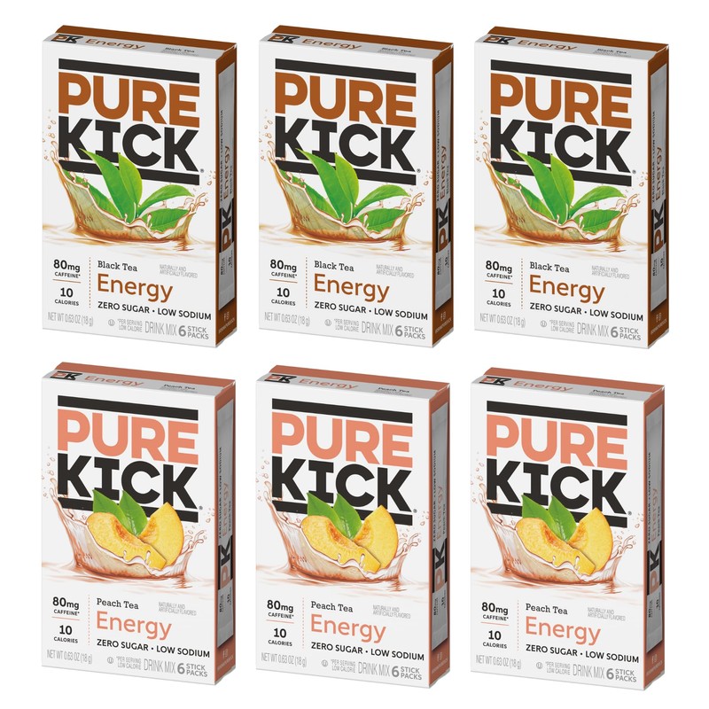 Pure Kick Energy Variety Pack - Pack of 6-3 of Each - Peach Tea and Black Tea - Low Calorie - Zero Sugar - Powdered Drink Mix