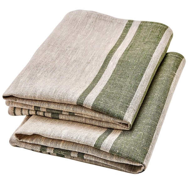 Pure Linen Kitchen Tea Towels - 100% Flax Linen Dish Towels 17 x 27 inch with Olive Green French Country Stripes - Flax Hand Towels - Set of 2