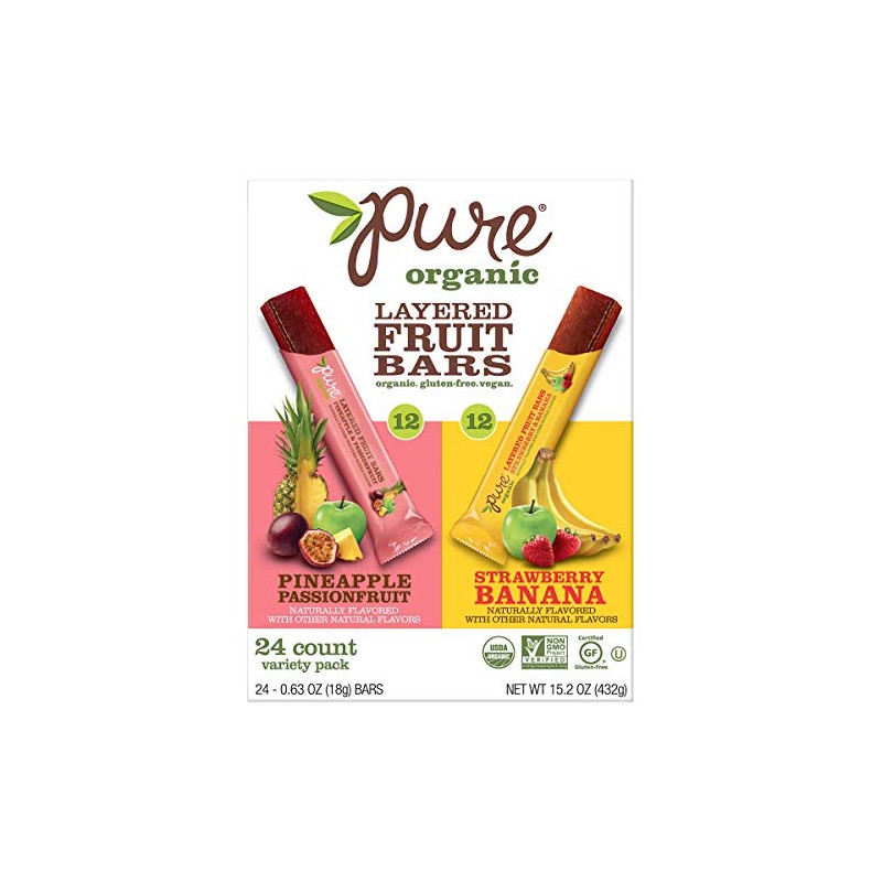 - Pure Layered Fruit Bars are USDA-certified Organic, GMO-Free, vegan, gluten-free, and Certified Kosher. They are made from the FINEST INGREDIENTS, using real fruit and vegetable juices and fruit purees; they contain NO soy, dairy ingredients, cane sugar or syrup, artificial flavors or colors, and are produced in a peanut-free facility
