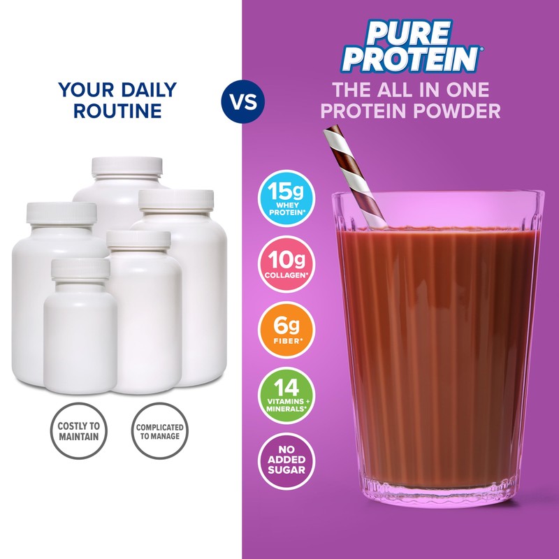 The Pure Protein All in One Protein Powder is a game-changing formula designed to simplify your daily nutrition with ingredients to help support lean muscle, skin, joints, and digestive health. Our blend of 15g whey protein, 10g collagen, 6g fiber, and 14 vitamins and minerals give you the everyday boost you need in one simple scoop. Delicious in a smoothie to start your day, or simply shake and enjoy post-workout. It's nutrition made easy, giving you more time to do what you love. Third Party Tested