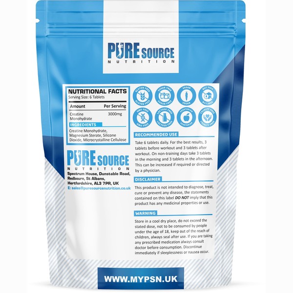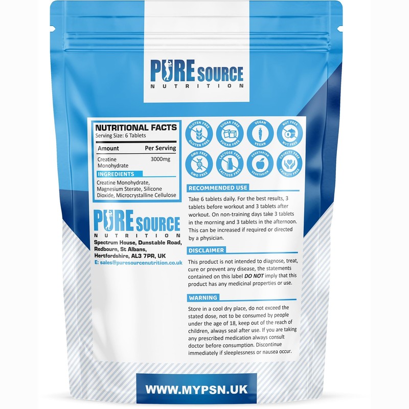 Pure Source Nutrition Creatine Tablets is suitable for Vegan, Vegetarian, GMO Free, Gluten Free, Halal and Kosher